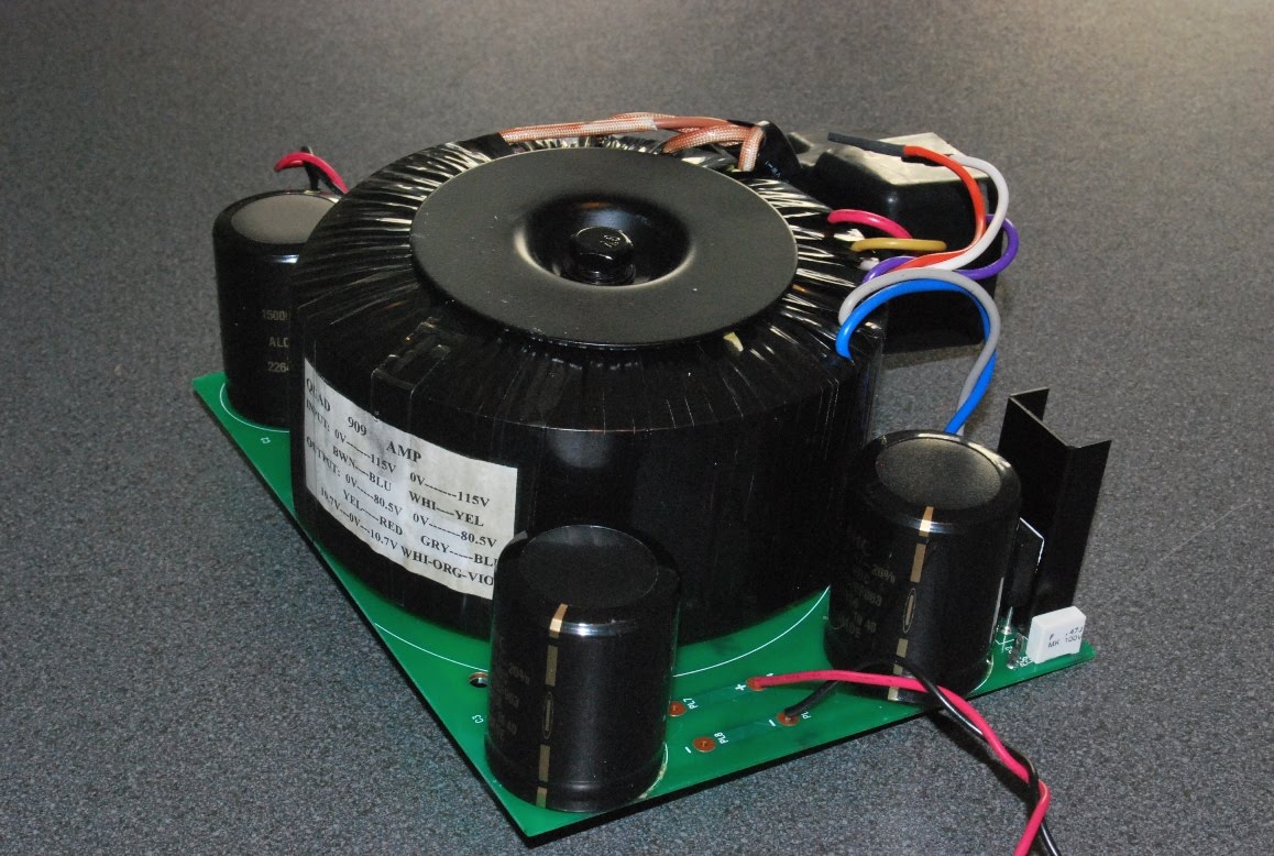 Dada is developing an new Printed-circuit board with a 500 Watt Amplimo transformer and 4x BHC ALC10C 15000µF for replacing the transformer and the capacitors in a 606 Mk1, making it an Mk2.